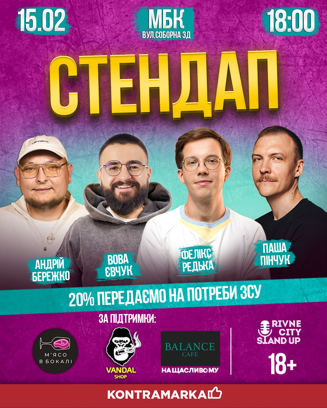 20% від проданих квитків ми передамо на потреби ЗСУ! Протягом 2023-2025 років зі стендап-концертів організованих нами у місті Рівного було передано 843 135 грн!