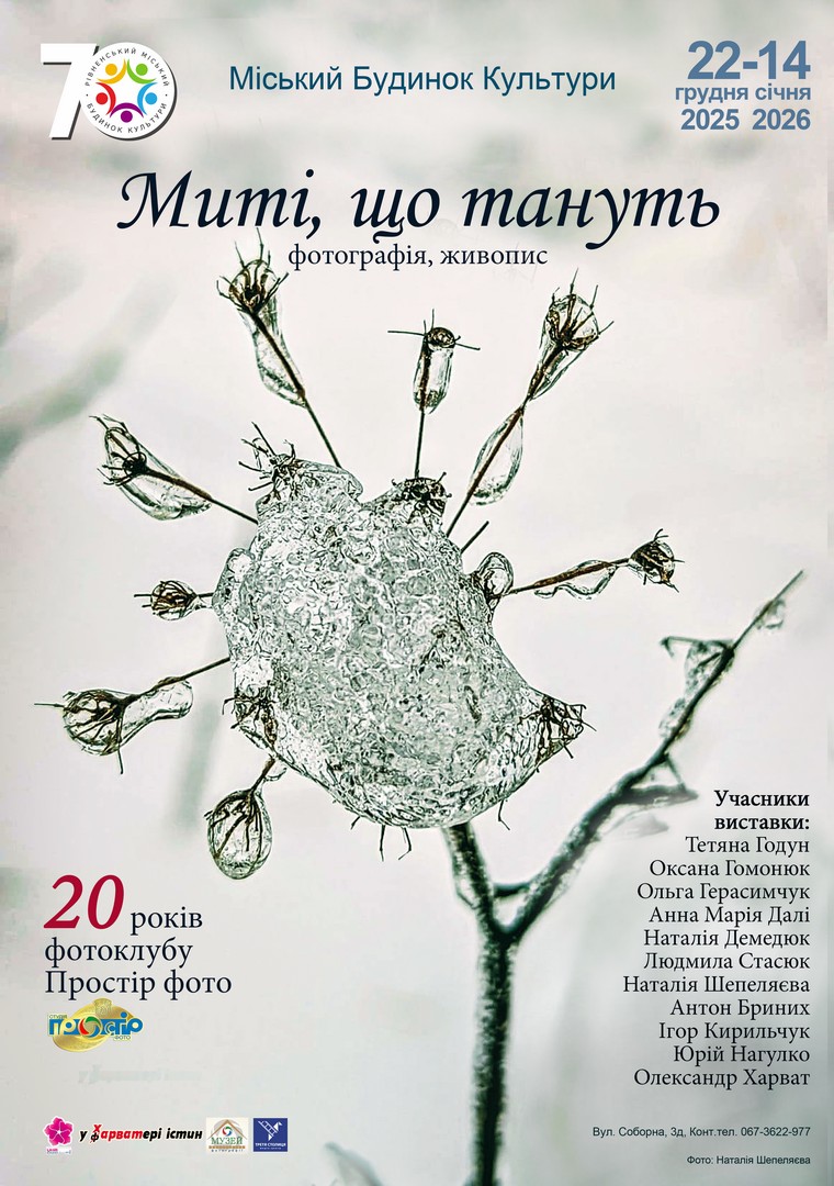 Наша виставка — мистецтво, як доказ життя! Це подорож крізь крижані сни та світло зимових днів. В експозиції – поезія зими, яка живе лише мить, сніг, що зникає під сонячним промінням, крига, яка поступається весні, і тиша, що розчиняється у світлі. Це історія про швидкоплинність часу та про те, як кожна мить, навіть найхолодніша, залишає теплий слід у пам’яті.