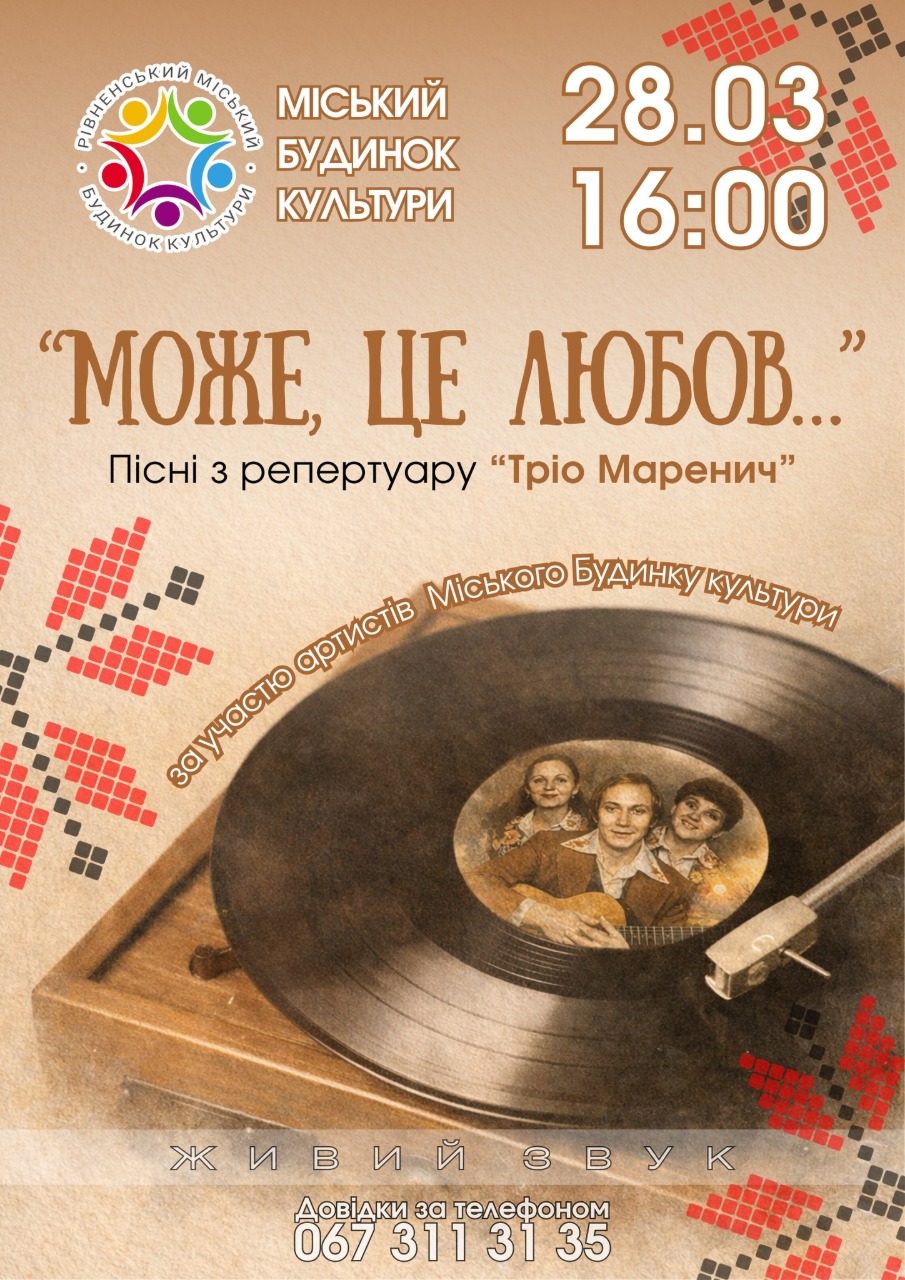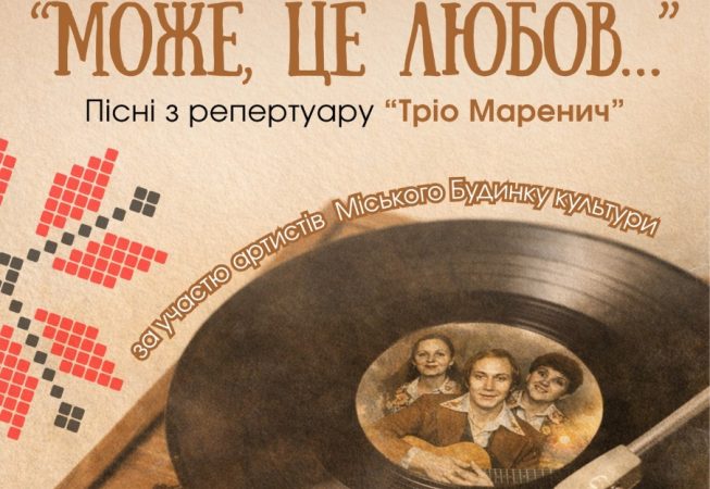 Міський Будинок культури відкриває цю унікальну скриню музичних спогадів і запрошує вас на вечір українського ретро 70-80-х років. 28 березня о 16:00 год на концерті “Може, це любов…” за піснями “Тріо Маренич” у виконанні артистів МБК звучатимуть добре знайомі композиції легендарного гурту. Музичні перевтілення будуть несподіваними, а приємний післясмак залишиться надовго. Повірте, нам є чим вас здивувати. Приходьте і, можливо, з вами станеться любов…