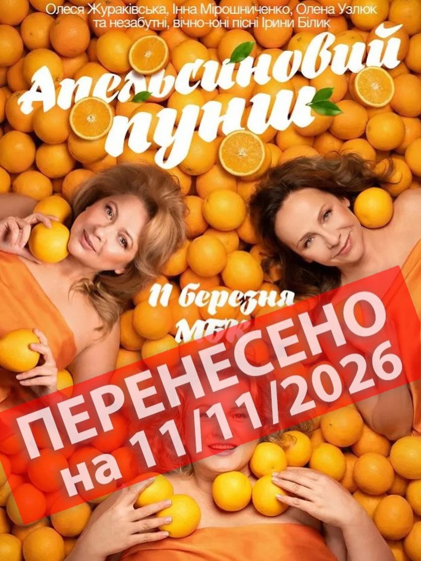 Організатори повідомили, що вистава «Апельсиновий пунш», яка мала відбутися в Міському Будинку культури 11/03/26, переноситься на 11/11/26 з технічних причин.